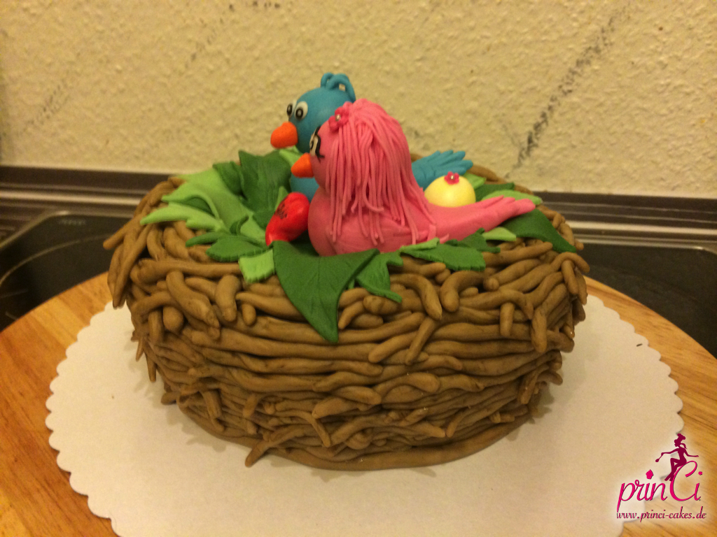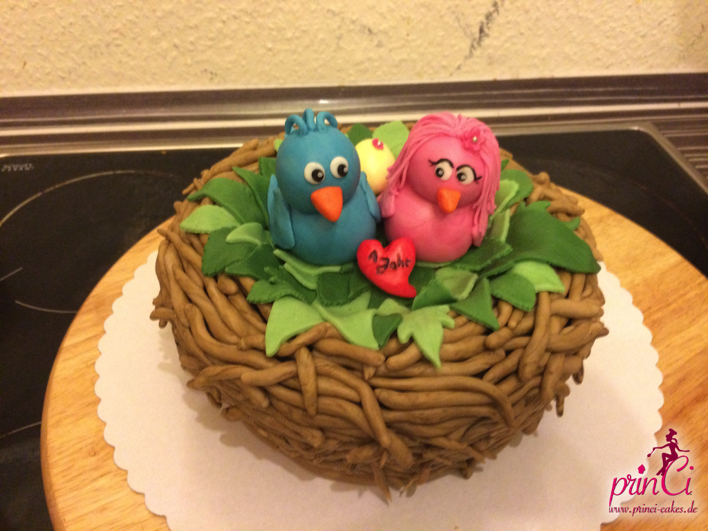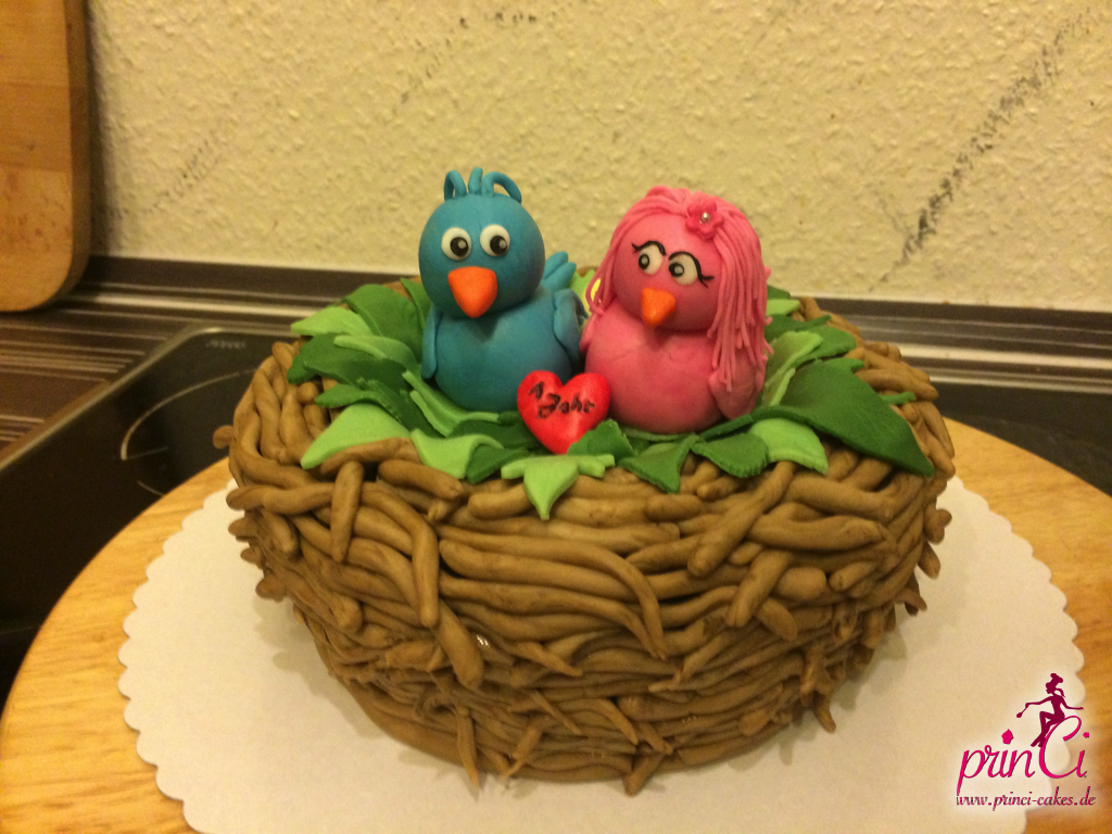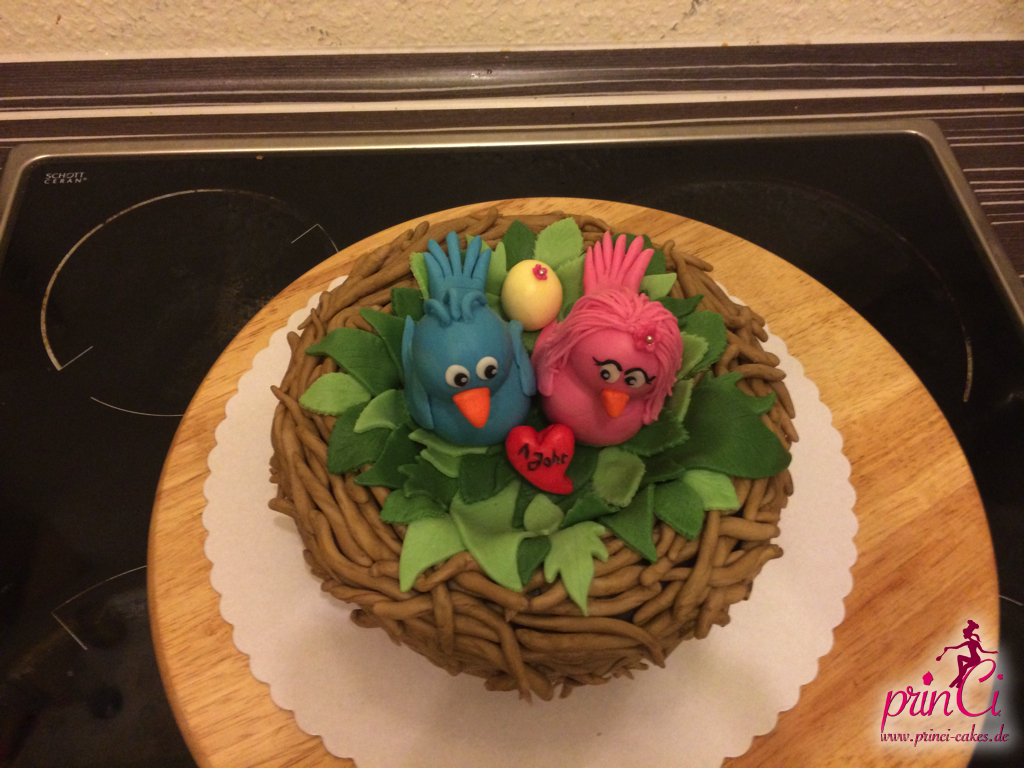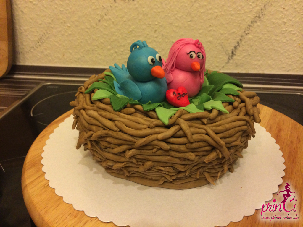 Zum 1. Hochzeitstag einer Freundin gab es eine zuckersüße Torte in Form eines Vogelnestes. Mit zwei Vögelchen aus Fondant und einem Ei für das süße Kind :)