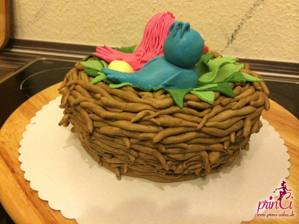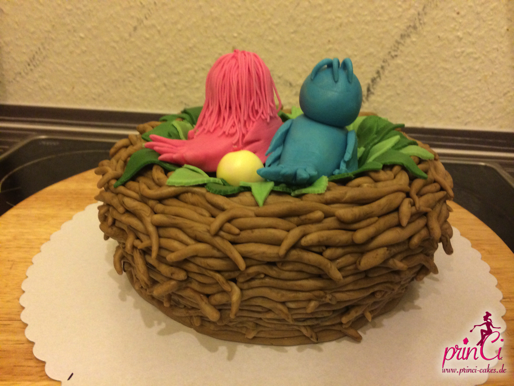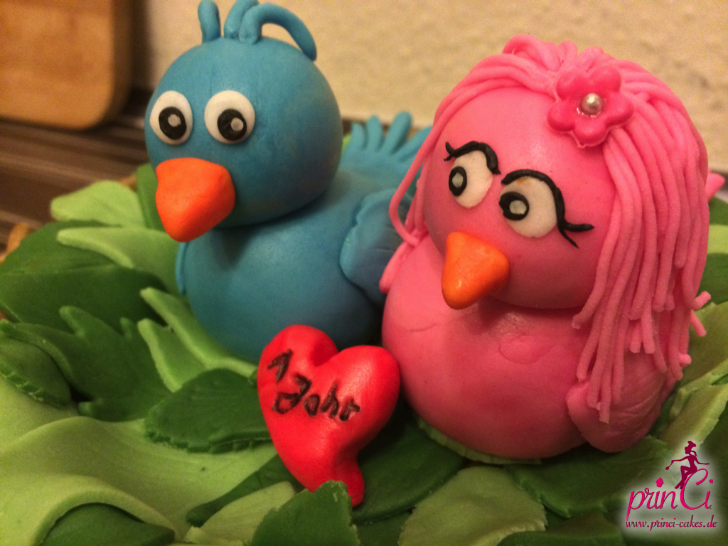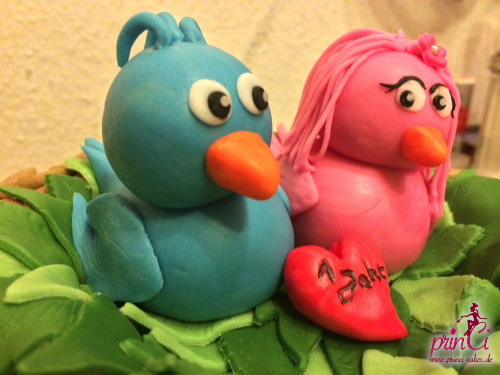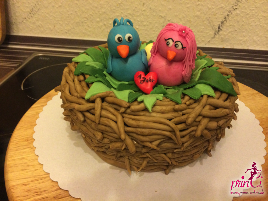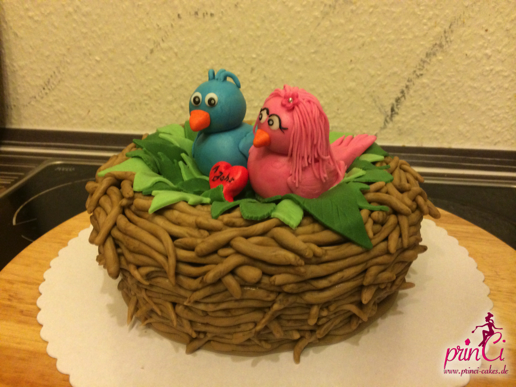 Zum 1. Hochzeitstag einer Freundin gab es eine zuckersüße Torte in Form eines Vogelnestes. Mit zwei Vögelchen aus Fondant und einem Ei für das süße Kind :)